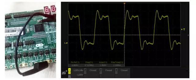 以晶振信號測量為例,如圖1所示為常規(guī)的鱷魚線接地測量方法,可看到信號過沖嚴(yán)重伴隨振蕩,和想像中的方波不一樣。而圖2所示的短地線彈簧接地測量方法,波形端正不少,顯然工程師的方法沒錯。