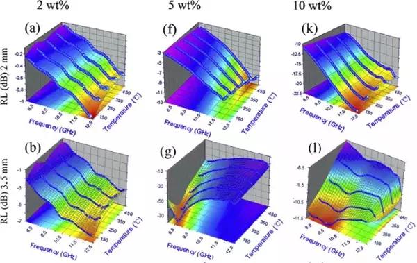 圖4、不同厚度下溫度及填料含量對(duì)微波吸收性能的影響