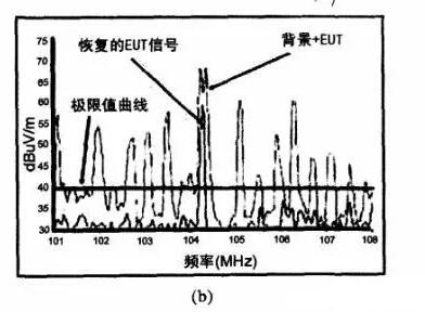 系統(tǒng)在“消除”背景噪聲方面.采用了“時間/頻率/相位”同步識別技術,通過相位識別,把背景噪聲用傅立葉計算方法剔除掉,并能提取被調(diào)制的EUT的信號,也能提取與背景噪聲頻率一致的EUT信號,見圖4(b)所示。