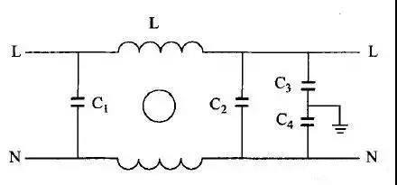 其中差模電容C1、C2用來短路差模干擾電流,而中間連線接地電容C3、C4則用來短路共模干擾電流。共模扼流圈是由兩股等粗并且按同方向繞制在一個磁芯